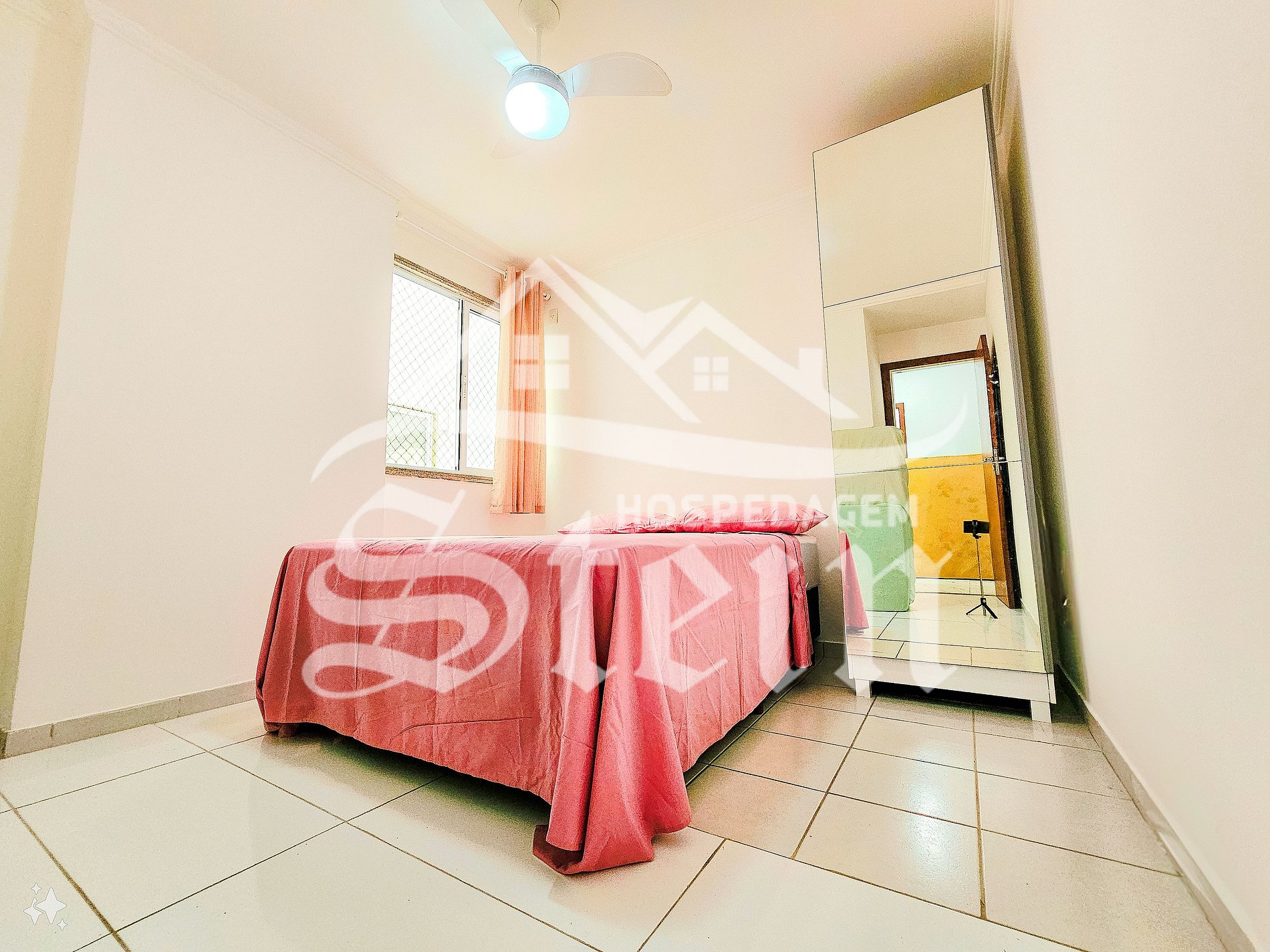 A suíte conta com uma confortável cama de casal, um guarda-roupas amplo, ventilador de teto e uma pequena varanda, com vista para o mar. O segundo quarto possui uma cama de casal e uma cama de solteiro e ventilador de teto. Já o terceiro quarto, possui uma cama de casal, alguns colchões extras para serem um usados onde melhor atender a reserva e ventilador de teto.