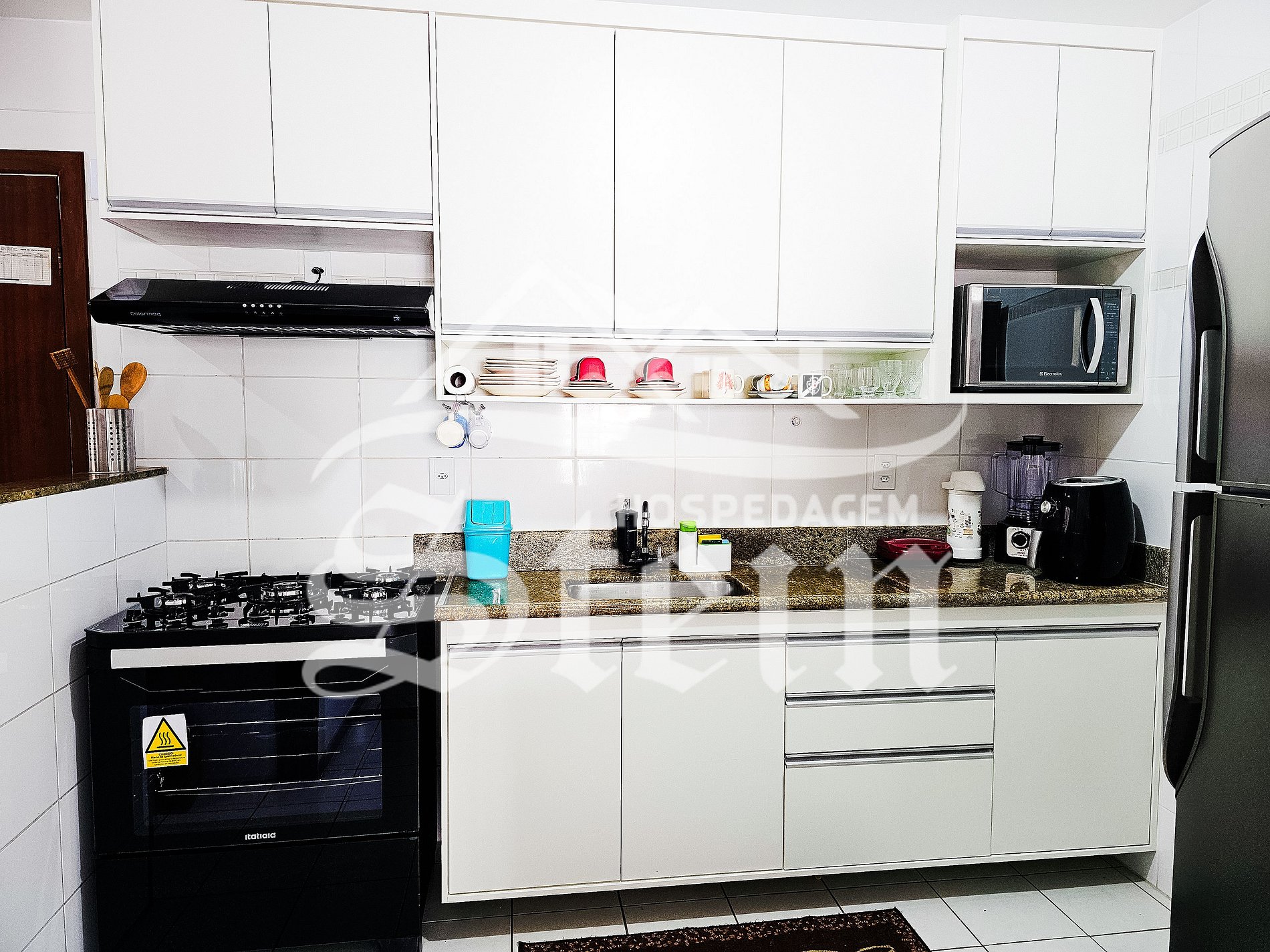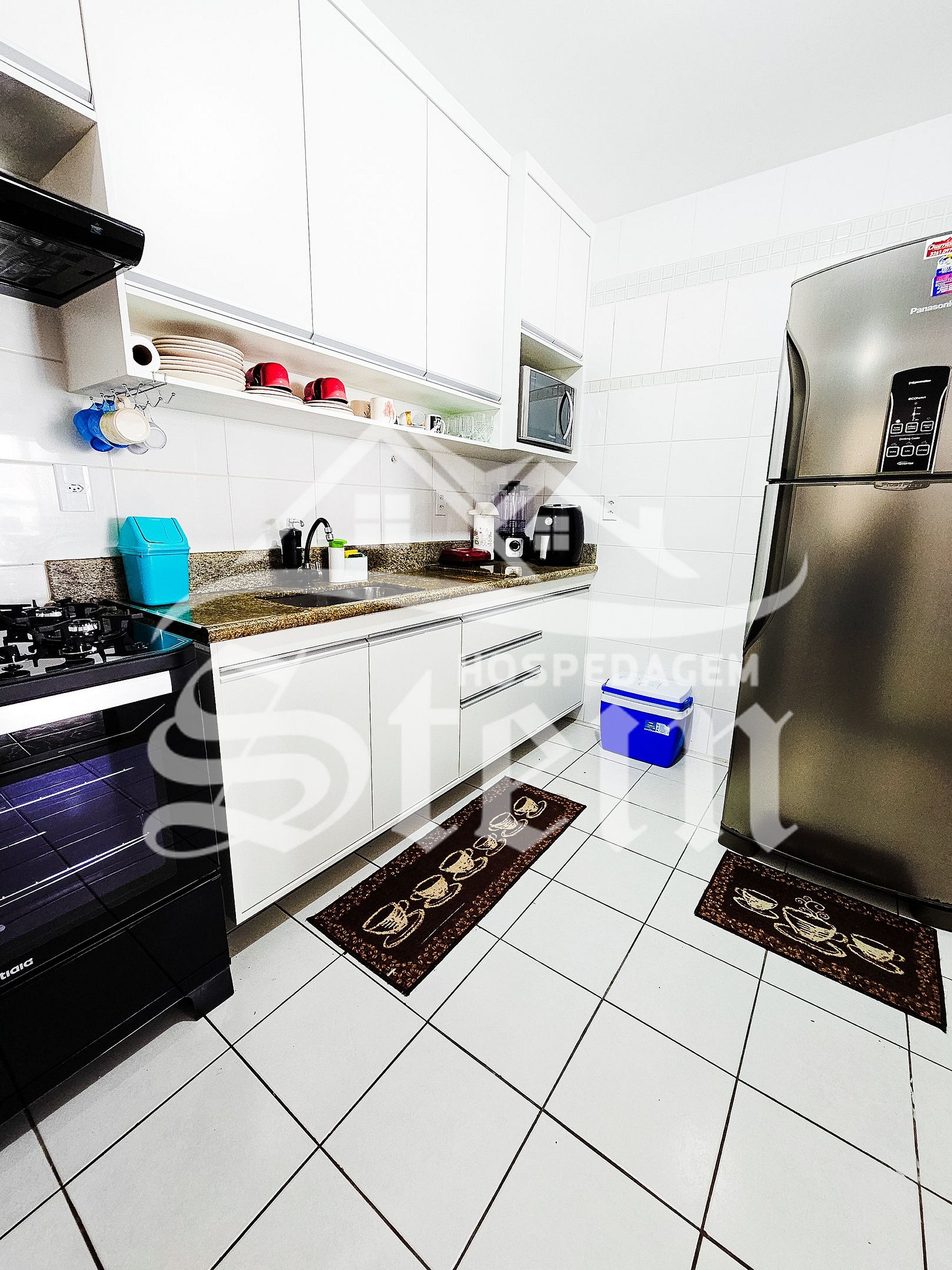 Nossa cozinha é altamente equipada, com uma geladeira duplex, um fogão automático de 4 bocas, um micro-ondas, uma airfryer, um forno elétrico e uma sanduicheira elétrica. Dispomos de uma vasta gama de talheres, pratos, utensílios, copos, taças e panelas, que atendem perfeitamente às necessidades dos 8 hóspedes possíveis no apartamento. A cozinha está conectada a uma pequena área de serviço, onde se encontra uma pia. Nessa área, guarda-sol e 3 cadeiras, proporcionando uma excelente comodidade adicional para aqueles que optam por ficar em nosso apartamento.