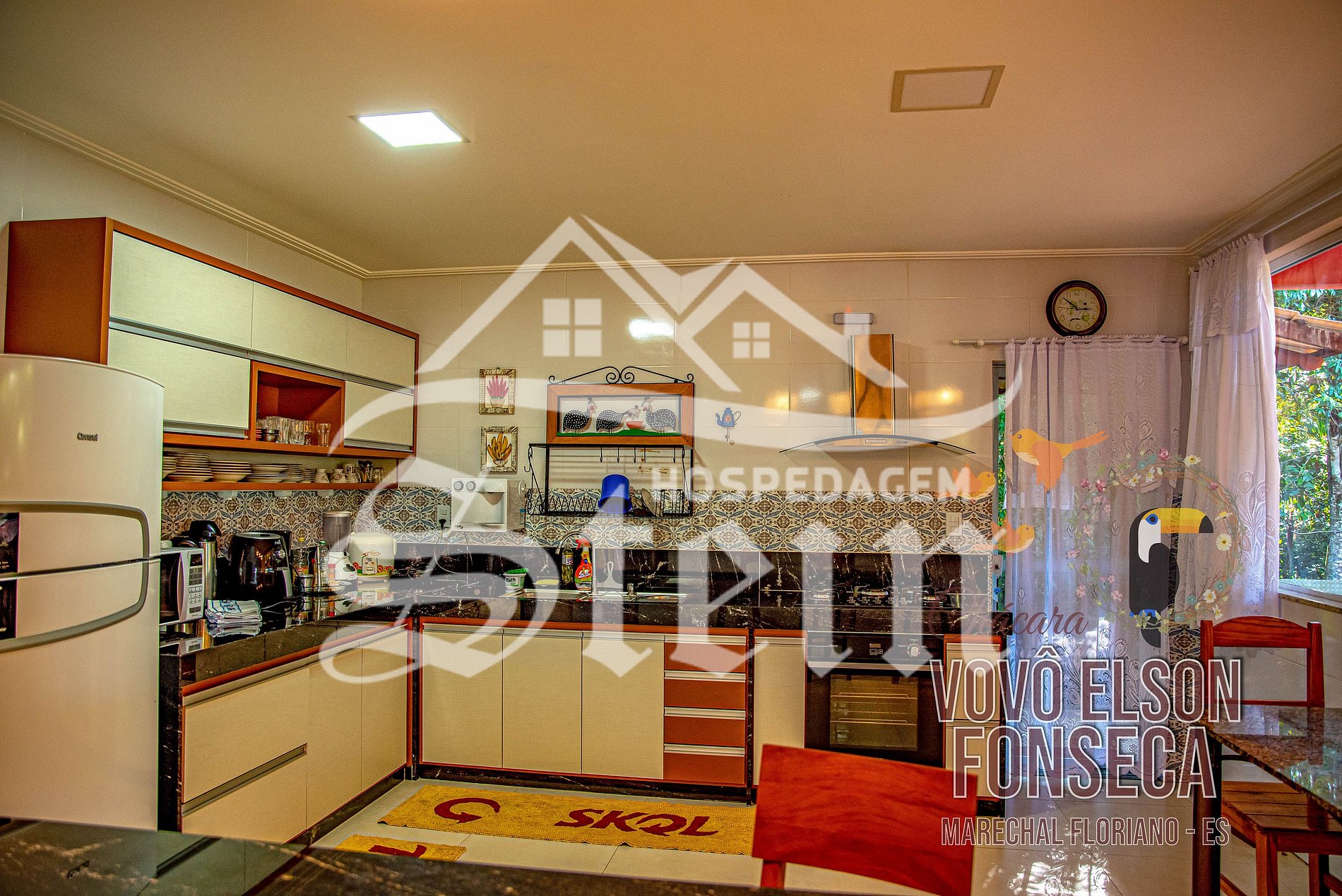 - Cozinha americana com geladeira duplex,fogão de 5 bocas, forno, microondas, airfrier, sanduicheira, cafeteira, panelas e vasta gama de utensilios de cozinha;