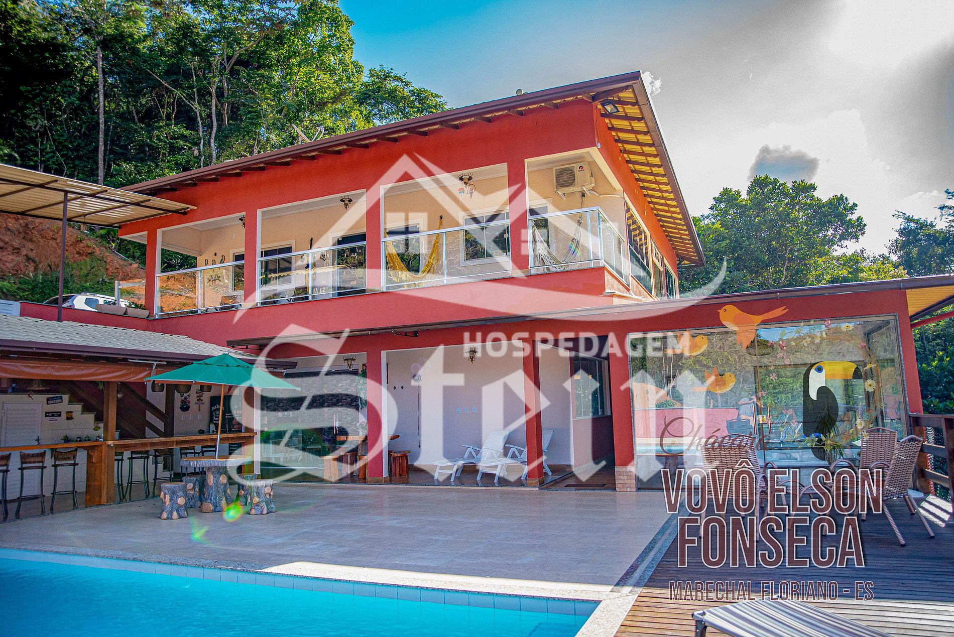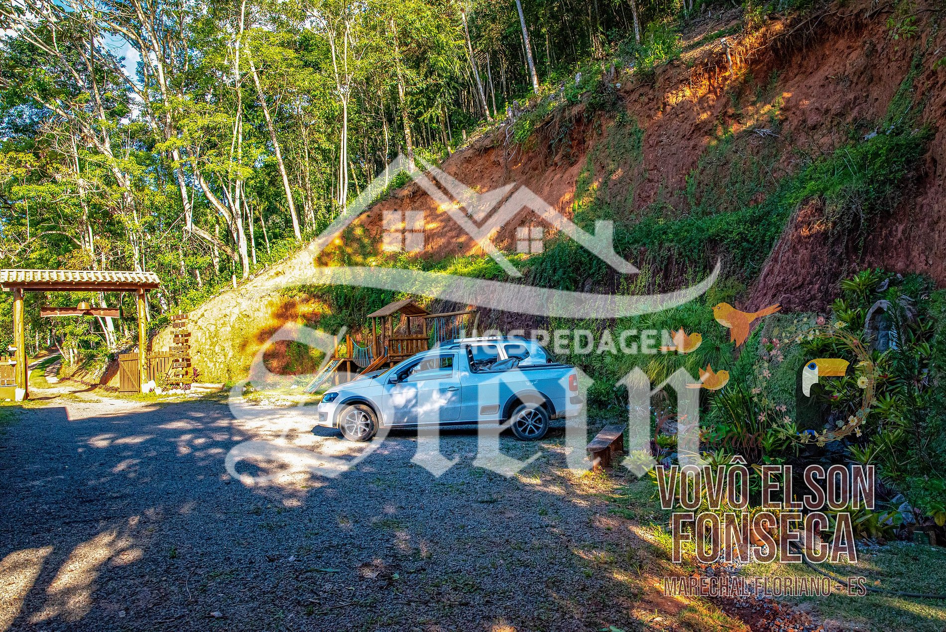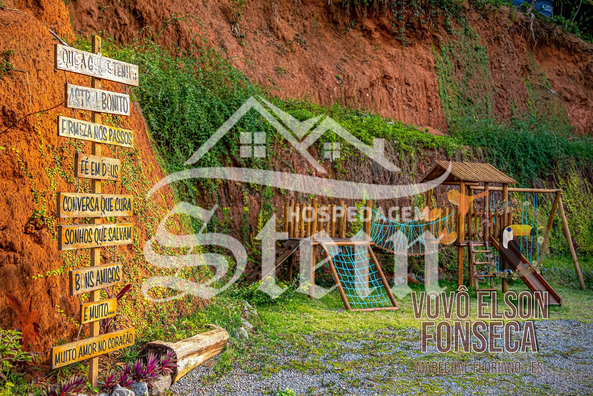 Localizado somente 3 quilômetros do centro de Marechal Floriano, a Chácara Vovô Elson Fonseca possui uma área de 1.900 m², com casa duplex composta de: