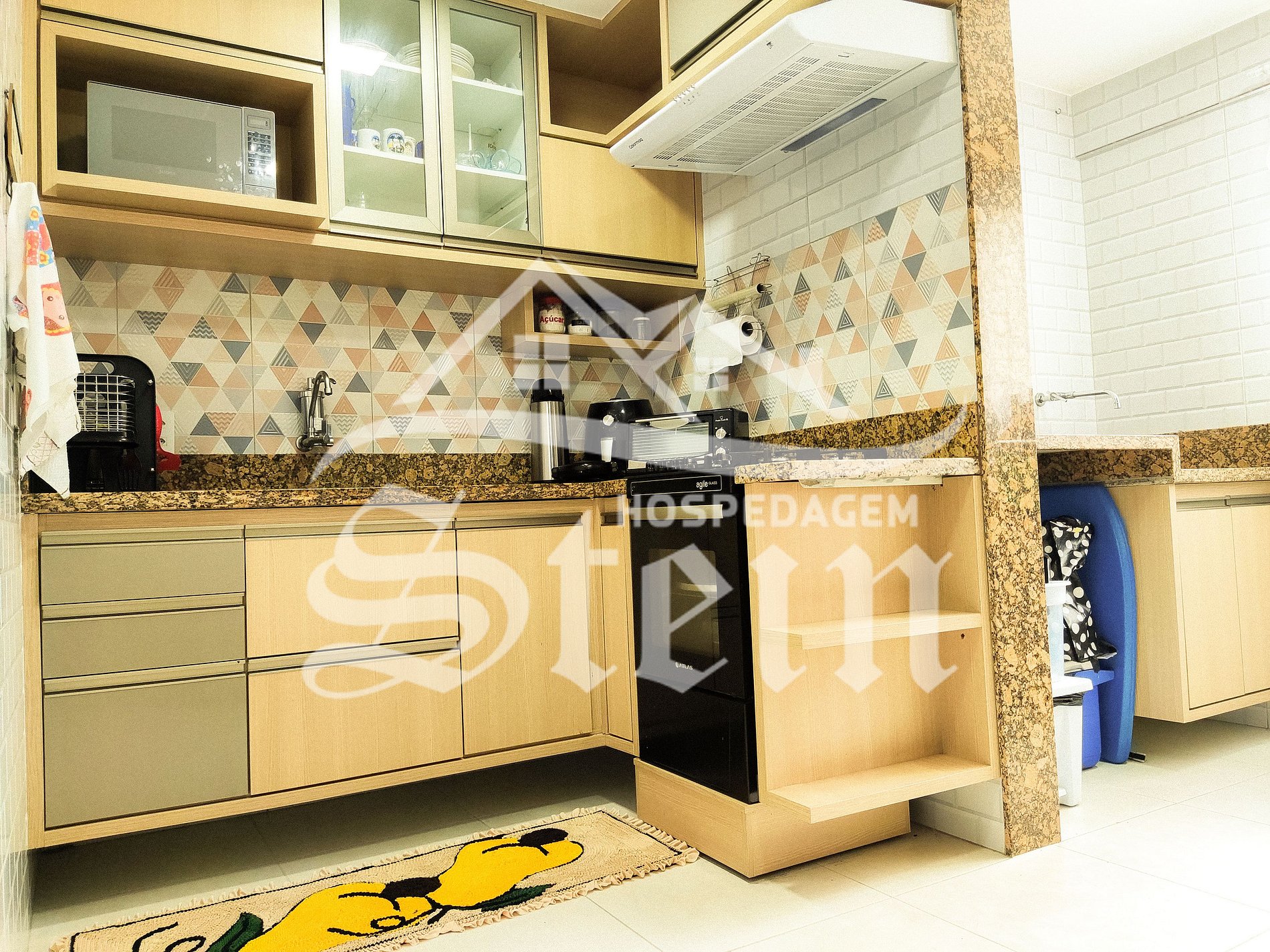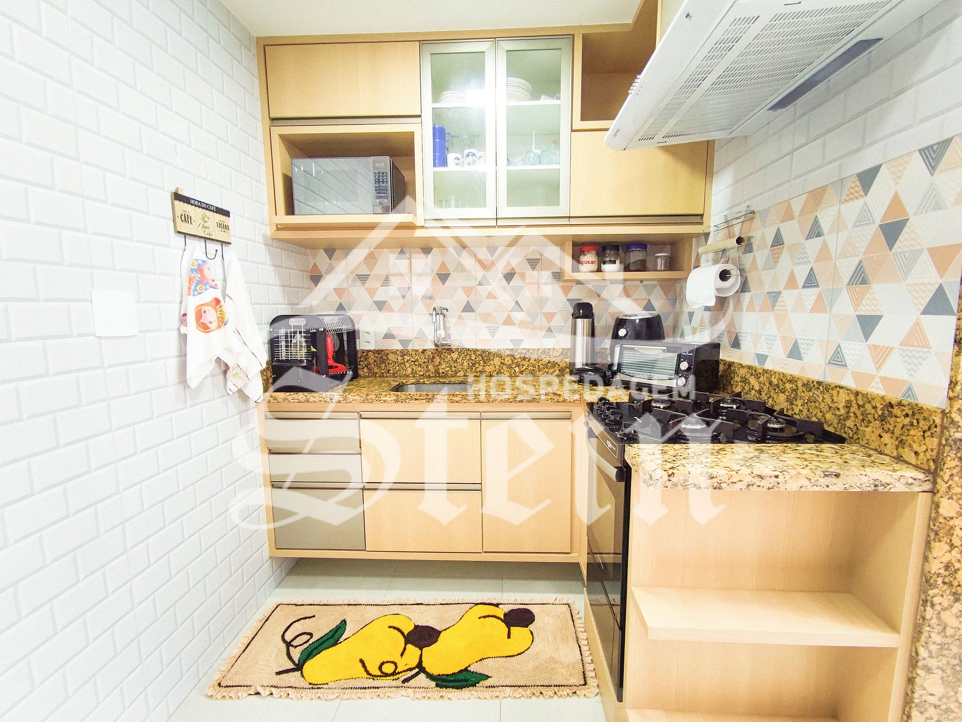A cozinha está conectada a uma pequena área de serviço, onde se encontra uma pia. Nessa área, disponibilizamos um carrinho de praia com guarda-sol e 3 cadeiras, proporcionando uma excelente comodidade adicional para aqueles que optam por ficar em nosso apartamento.