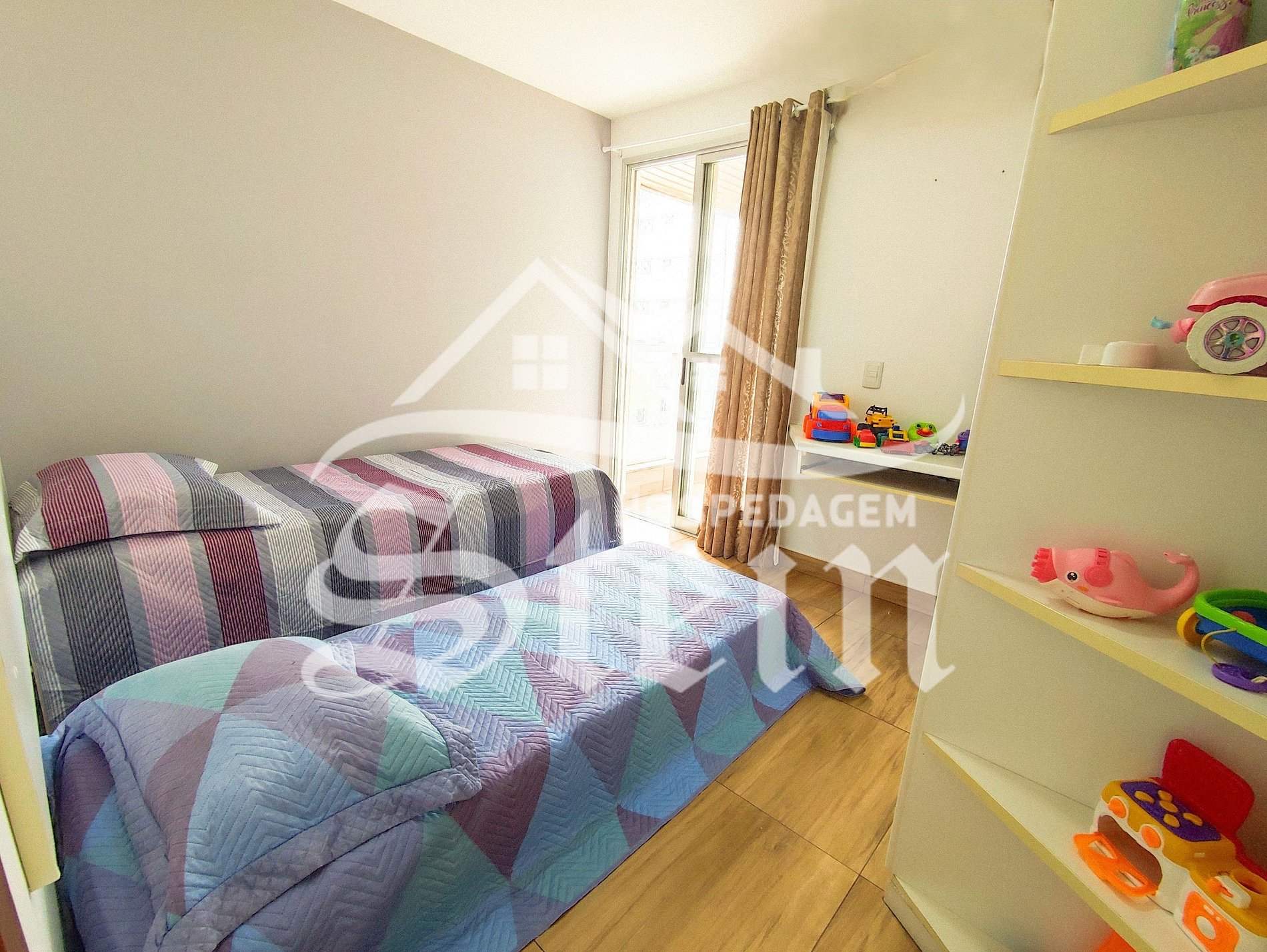 O apartamento possui uma composição de 2 quartos, sendo um deles uma suíte. Além disso, dispõe de uma cozinha completa, uma espaçosa sala de estar/jantar, um banheiro social e varandas, todas elas equipadas com telas de proteção.