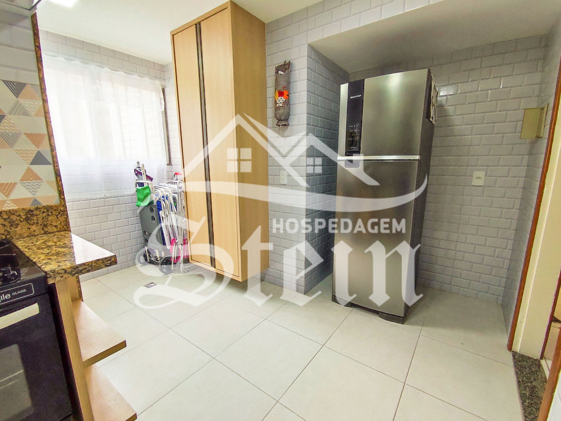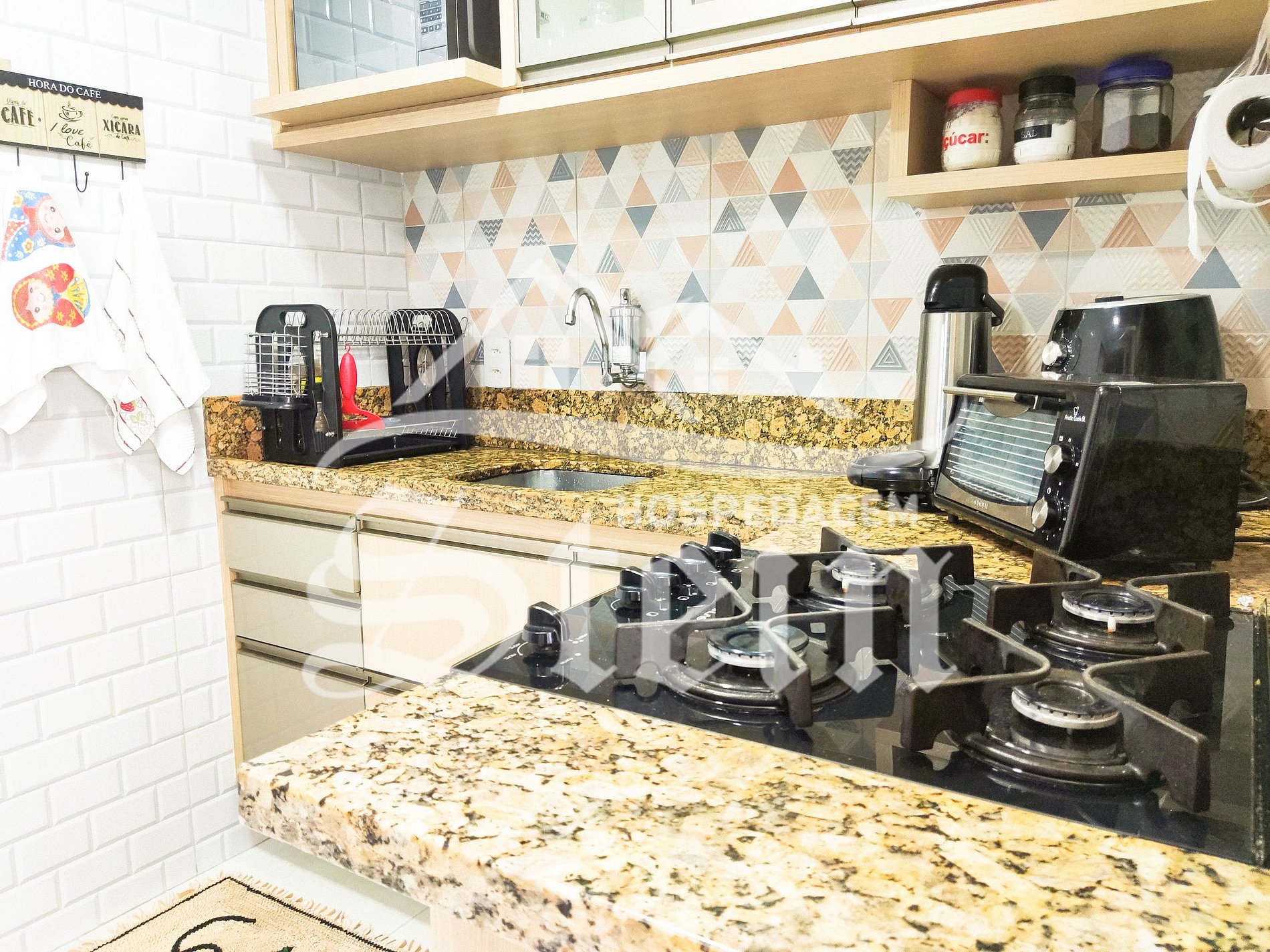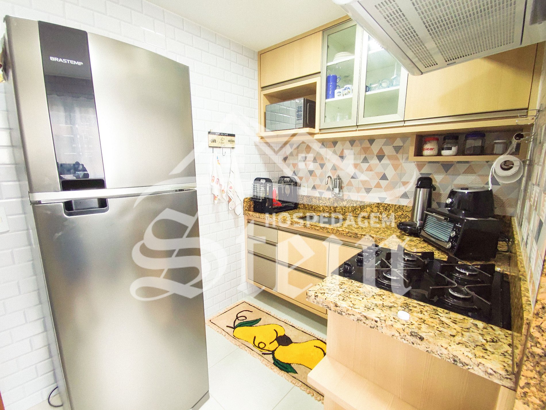 A cozinha está conectada a uma pequena área de serviço, onde se encontra uma pia. Nessa área, disponibilizamos um carrinho de praia com guarda-sol e 3 cadeiras, proporcionando uma excelente comodidade adicional para aqueles que optam por ficar em nosso apartamento.