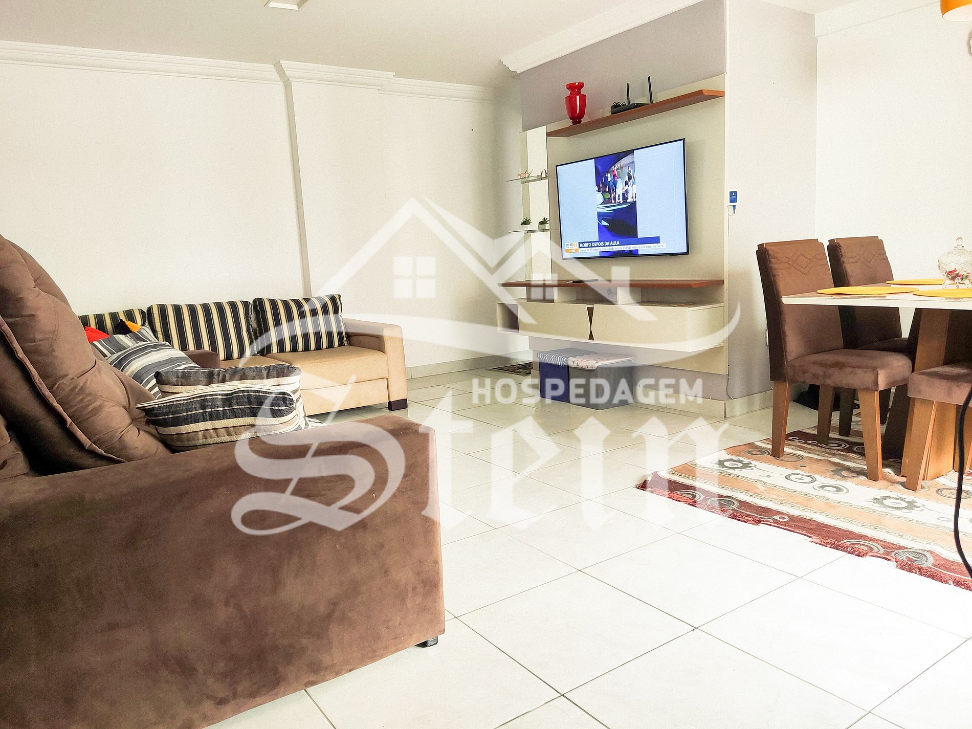 A sala de estar apresenta dois sofás enormes e retráteis, com capacidade para 3 pessoas cada, e uma TV Samsung de 50" com diversos serviços de streaming já instalados. Nesse espaço, também há uma mesa com 4 cadeiras para refeições. Na varanda da sala, oferecemos outra mesa com 4 cadeiras, para que os hóspedes possam apreciar a deslumbrante vista para o mar.
